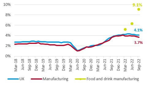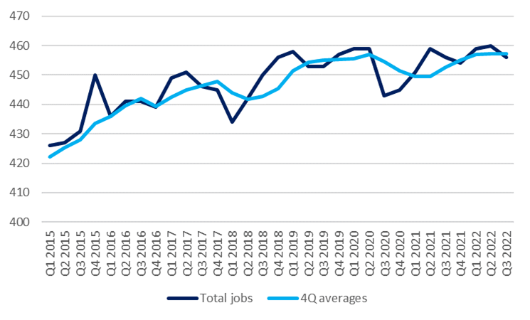 Latest data released by ONS shows that 4,000 jobs in food and drink manufacturing were lost in Q3, bringing the total number employed in our industry to 456,000. The number employed has been revised down by ONS and is around 20,000 lower than previous data releases. Employment in the sector had been on an upward trend for a while, but that trend has been now reversed. Jobs, measured by the 4-quarter averages - a better indicator of the underlying trend as seasonality is removed - has been persistently rising since Q1 2021.